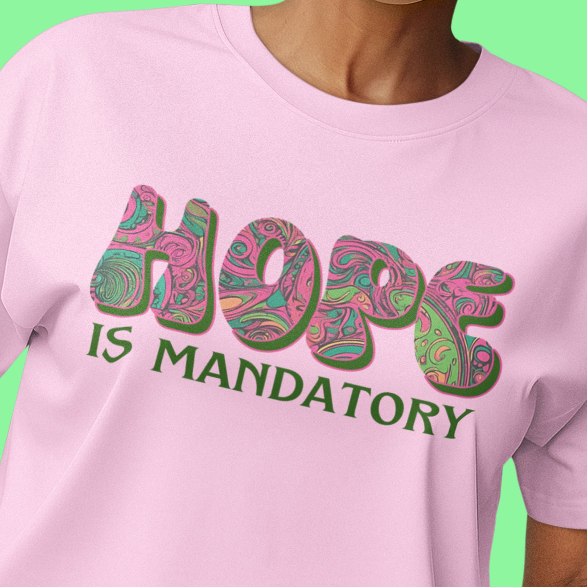 Introducing the HOPE IS MANDATORY T-Shirt – a must-have for anyone looking to make a bold and positive statement. Whether you're embracing the spirit and challenge of the times or simply want to uplift those around you, this tee is perfect for any season or reason.